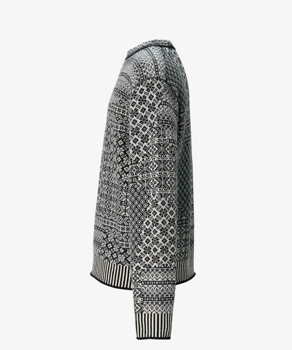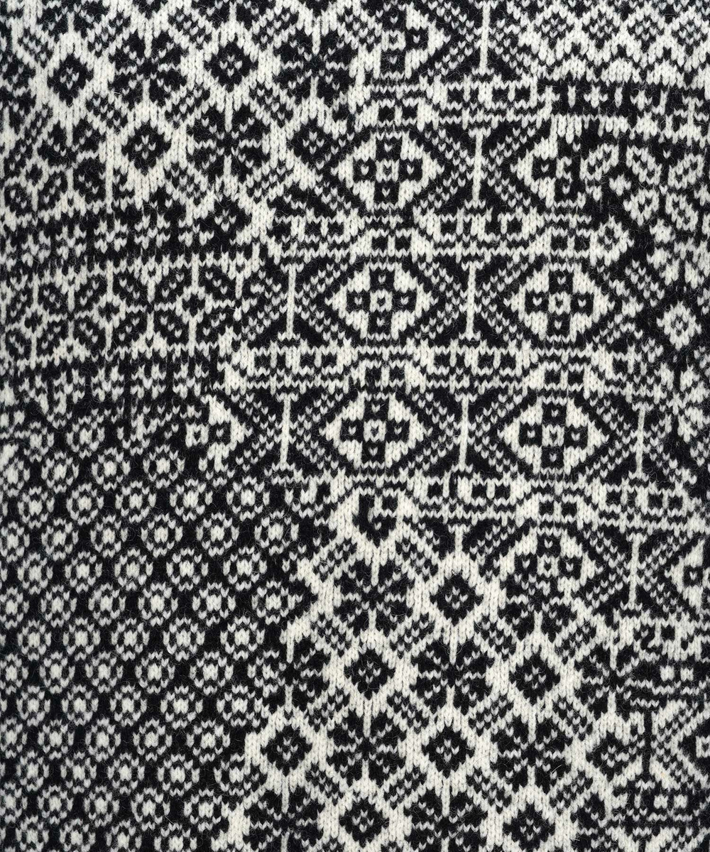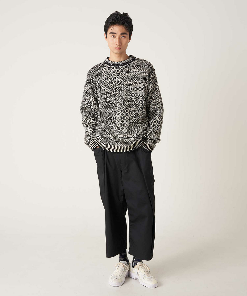 一見リブに見える裾や袖口も、触れると凹凸はなく縦縞に編まれています。パッと目に入る柄のインパクトだけではなく、細部にも拘りの詰まった一着。秋冬らしいやや厚みのある生地感とノルディック調の柄がポイント。コーディネートの主役になるおすすめアイテムです。