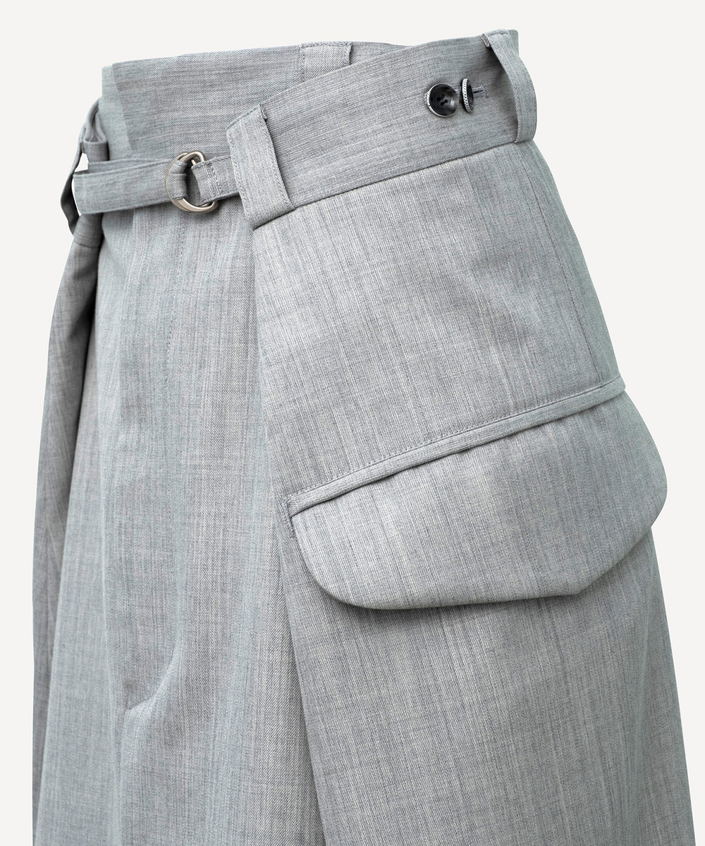 カンテレ・フジテレビ系 月10ドラマ『モンスター』(毎週月曜よる10時)とアンリアレイジがCOLLABORATIONし、主人公、亮子の法廷衣装を製作。 弁護士にとって、戦闘服ともいえる「法廷で着用するスーツ」を、アンリアレイジらしいディティールを活かしながら、上品かつエッジの効いたデザインで仕立てました。 アンリアレイジ定番のラッピングPantsをSkirtとして展開。 拡大されたウエストのあまり部分を身体に沿ってラッピングするように着用するデザイン。 ラッピング部分をウエストベルトでお好みに調整することでシルエットに変化を与えられるのも特徴です。