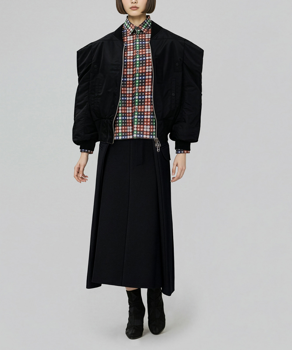 2025 A/W COLLECTION “SCREEN” で登場したロブロックスのアバターを思わせるブロック状のシルエットをMA-1に落とし込みました。 直線的に設計されたスリーブが独特のシルエットを演出します。 ハリのあるポリエステル生地に裏地がつくことで、よりブロック感が強調される仕上がりに。 短めの着丈が袖のデザインを際立たせ、コンパクトでバランスの取れた印象になります。 今シーズンを象徴するシルエットを楽しめる、コーディネートの主役となる一着です。 ------------------------------------------- 2025 A/W COLLECTION “SCREEN” 黒い画面、それは無限の可能性を秘めた空間。 森永邦彦が描く2025-26年秋冬コレクションは、黒い服が液晶スクリーンとなり、あらゆる色やパターン、メッセージ、グラフィックを映し出す未来を想像させる。服はメッセージを拡散し、視覚や情報の流れを映し、変換するメディアへと進化する。それは、20世紀初頭のサンドイッチマンやスローガンT-shirtsの、液晶スクリーン時代における進化形とも言えるだろう。 このスクリーンの服は、着る人の気分に応じて瞬時に変化し、CMYKでは再現不可能な鮮やかなデジタルRGBカラーを映し出し、膨大なデザインや様々な模様を浮かび上がらせる。光のパターンは現れては消え、新たなデザインを絶え間なく生み出し続ける。まるで生命のように、デザインには完成形がなく、最終形は存在しない。 > 2025 A/W COLLECTION “SCREEN