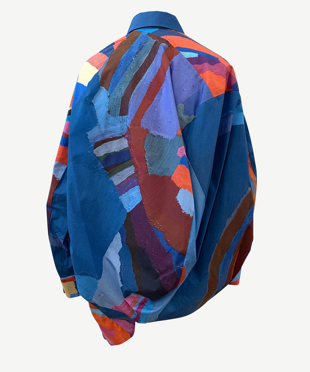 ボールの立体に着せ付けることができるパターンを用いたシャツは、身体に添うことで規則的だった形が自然なドレープとなり、ボリュームのあるシルエットに変換されます。