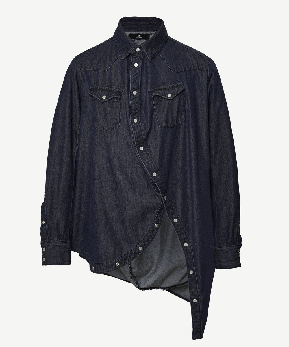 アンリアレイジ定番のボールシャツをデニムシャツとして製作。
