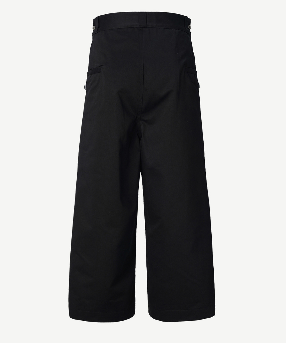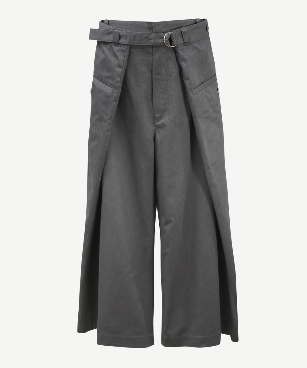 ANREALAGE’s signature wrapping chino pants have been updated. The distinctive silhouette is created by wrapping the excess fabric from the widened waistband. Adjusting the wrapped section with the waist belt allows for flexible changes in shape and fit. Crafted from a polyester twill fabric with mechanical stretch that responds to movement in all directions, the pants offer ease of movement and a light, comfortable feel while seamlessly fitting into everyday wear. The central fastening has been upgraded from a hook to a snap button, and the belt width and buckle have been refined with a D-ring design, making the pants even easier to put on and take off.