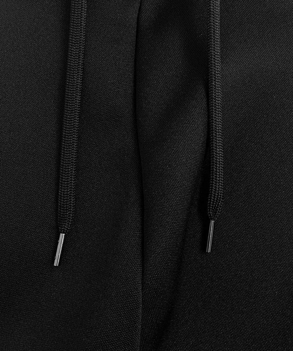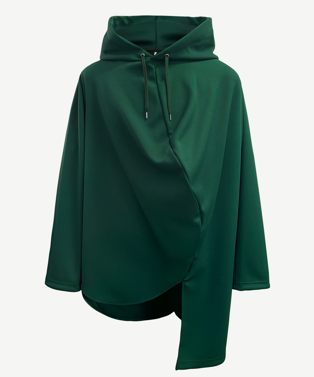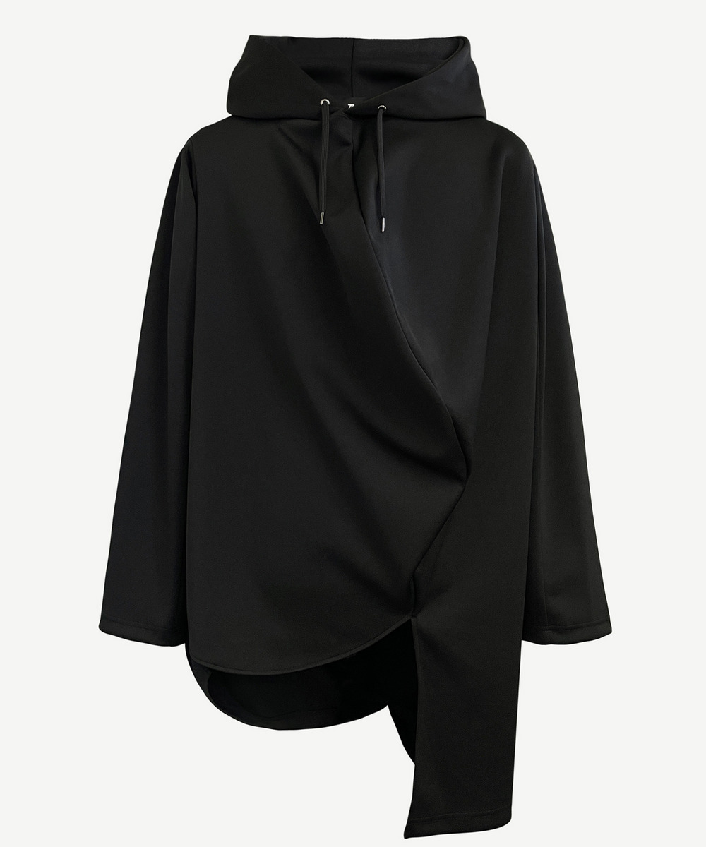 ボールの立体に着せ付けることができるパターンを用いたフーディは、身体に添うことで規則的だった形が自然なドレープとなり、ボリュームのあるシルエットに変換されます。