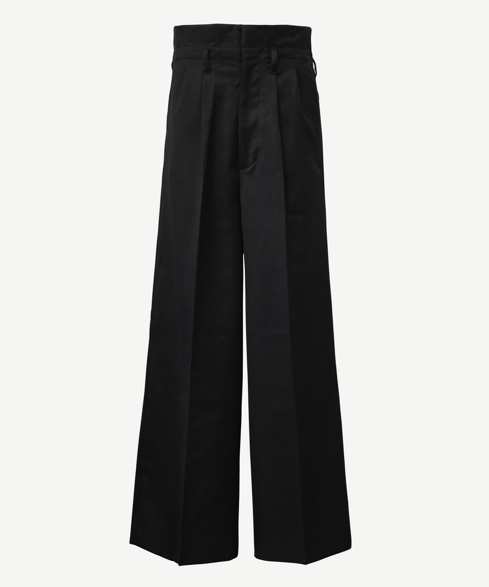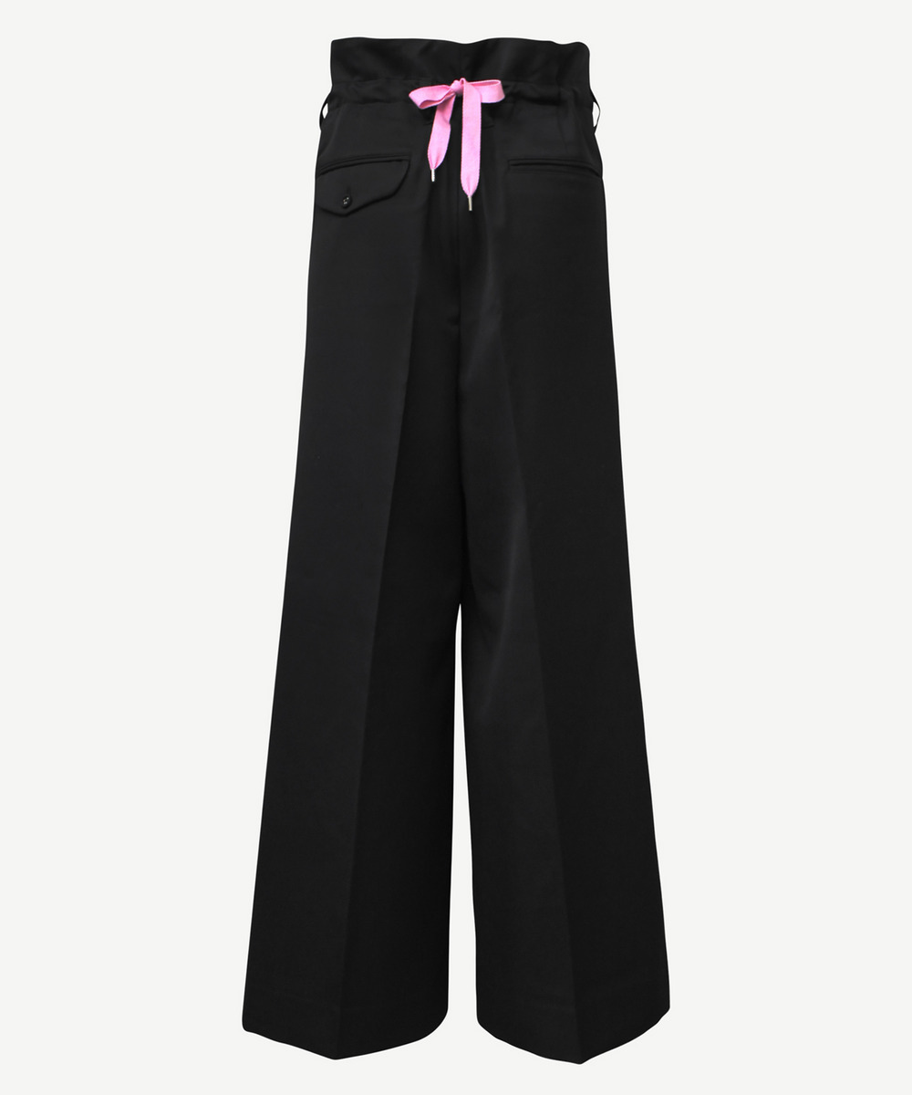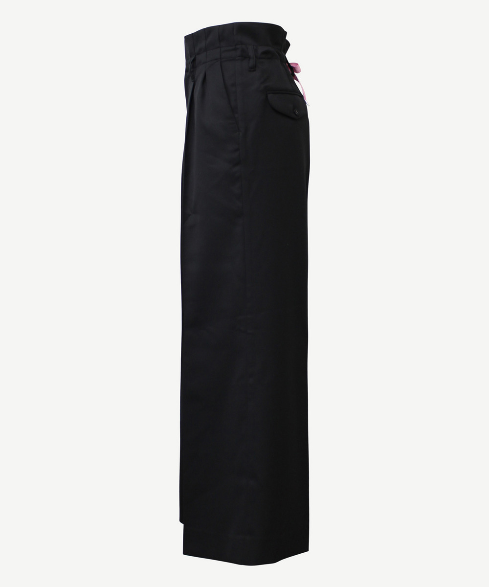anrealage homme ハイウエストと、ワイドでありながらスッキリとしたシルエットがポイント。前身頃はディテールを少なくし、背面はウエストを絞って結ぶ、装飾性を持たせたデザイン。anrealage hommeの象徴的なカラーであるピンクのリボンがアクセントに。 生地はウールとヴィスコース素材を使用し、滑らかな質感が特徴です。 同素材のフェードラペルJacketとセットアップでの着用もおすすめです。