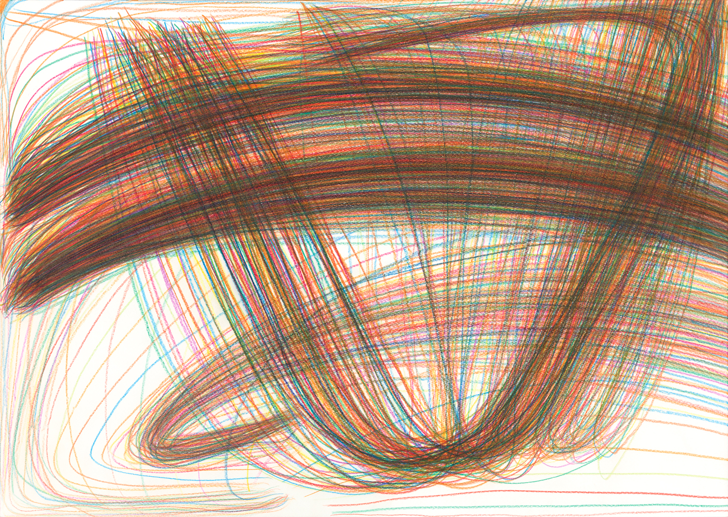 彼女の制作には、瞑想から生み出されるような果てしなさがある。完成形を目指して作り出しているのでなく、思いのままに打っていく点描や短い線の集積に何かを見出し、その世界にとめどなく没入して行く。ある時はふわふわと、夢見るように周囲の誰かに笑顔で話しかけ、またある時は、一人自分の内側の世界に深く意識を沈めてる。そのまなざしは、彼女の心だけに映る何かを追いかけてたゆたう。不思議な空気が彼女と彼女の制作には漂っている。