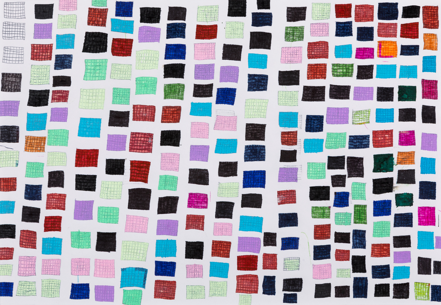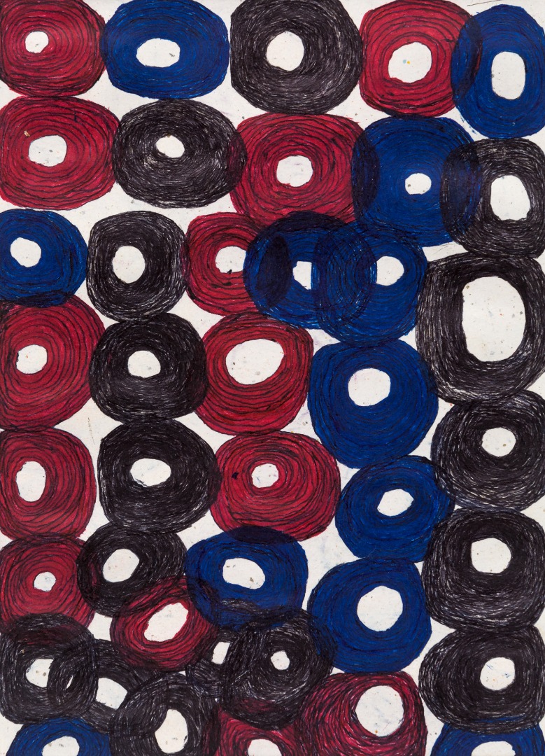 1996年生まれ 滋賀県在住 2015年から『やまなみ工房』に在籍 もともと創作活動に消極的だった彼が、気負いなく作業感覚で取り組める方法のひとつとして、スタンプ押しの活動が始まった。巻いて棒状にしたダンボール紙や紙コップ、ゴム判子等、様々な素材の判子を用いて自分の好きな色を決めて、判子を一つ一つ確実に丁寧に押してゆく。取り組む中で徐々に創作に対する苦手意識から解放され、作品が完成するたびにやりがいや喜び、そして彼の中で創作に対する自信が深まった。 今では内向的な彼が自己表現の一つとして取り組める活動となる。