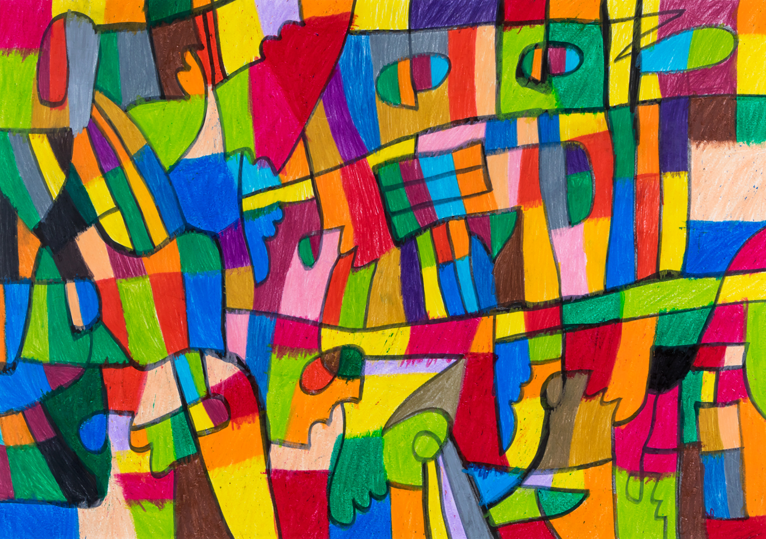 美術ワークショップに参加してから、日常的にアートに親しむようになる。隙間なく埋める極彩色の抽象画は、見続けていると立体的に見える瞬間があり、多くの人を惹きつける。