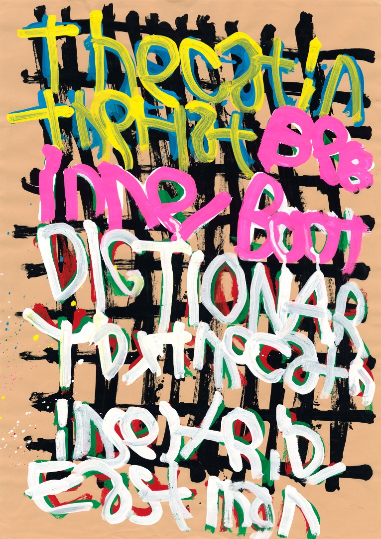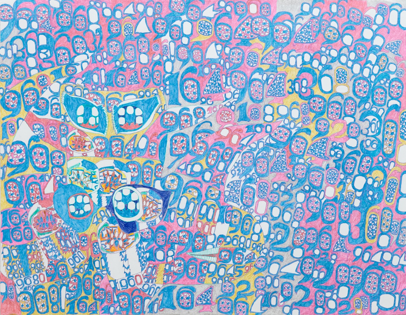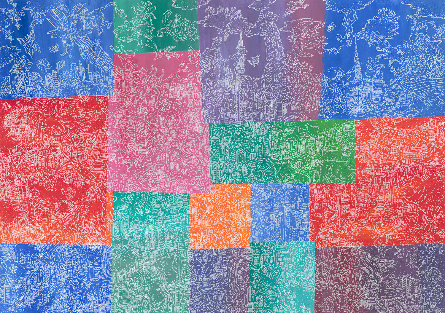 水性ブラシマーカーを用い、躍動に満ちた色彩ひしめく緻密な画面を生み出す。