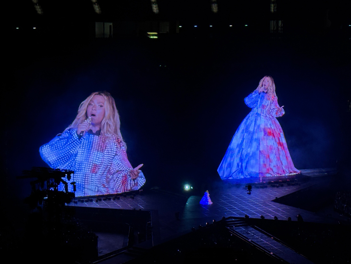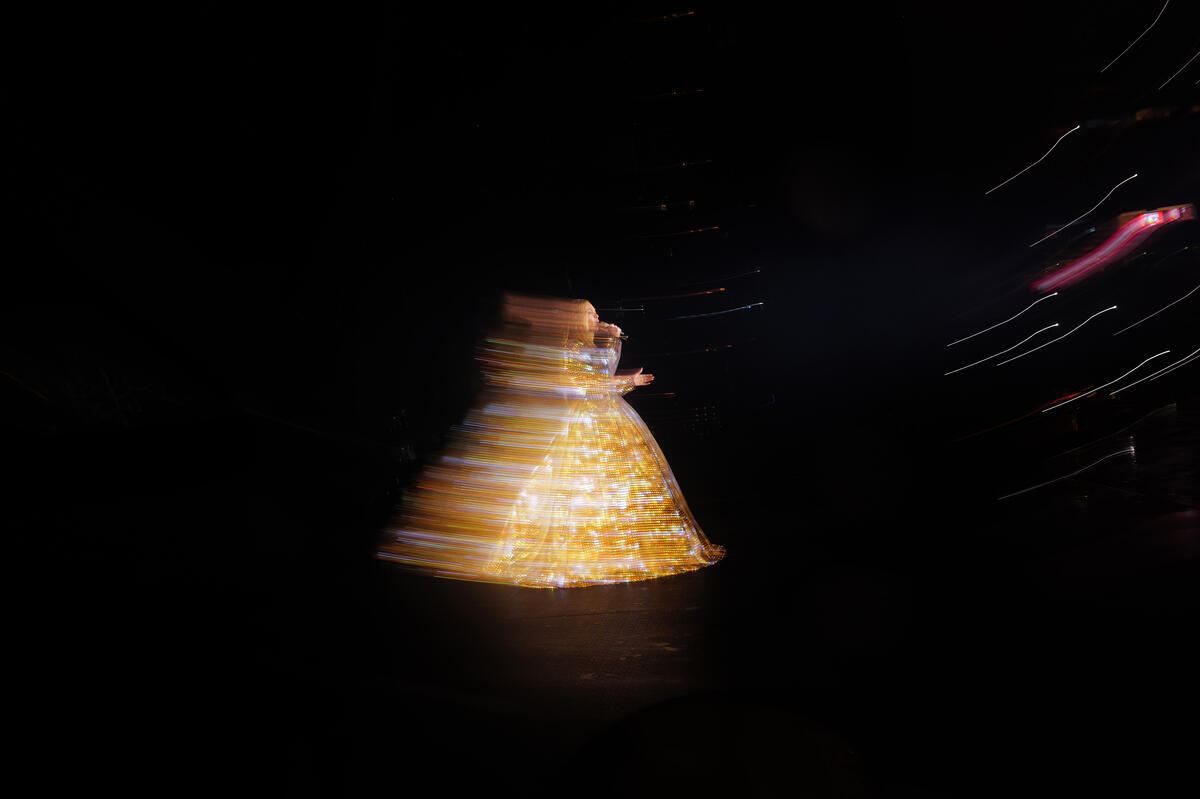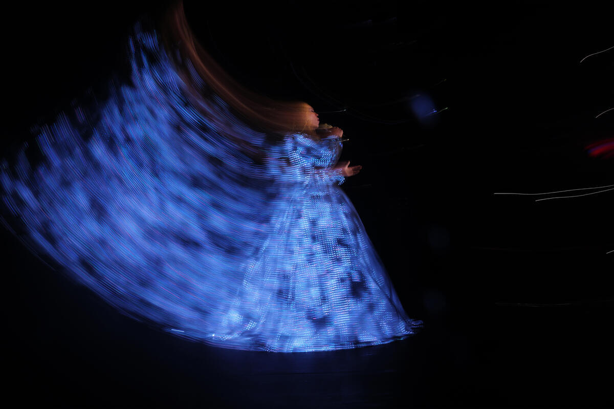 このDRESSは、楽曲「DAUGHTER」に合わせてプログラムされており、赤のタータンチェック柄から半身が青のチェックへ、さらに真紅のスパンコール、黒一色のロンプルイユ風レース模様へと、次々に変化していく。その後、ゴールドの輝きを放つスパンコールDRESSから、アメリカ国旗を想起させる赤・白・青のノイズパターン、そして白黒へのステンドグラス模様のグラフィックが現れ、フィナーレでは、ステンドグラスの光が星々の爆発のように広がり、やがて宇宙の闇へと溶け込む。その闇から再び光が降り注ぎ、DRESSがまばゆい輝きをまとって完成するという、壮大な演出が展開される。