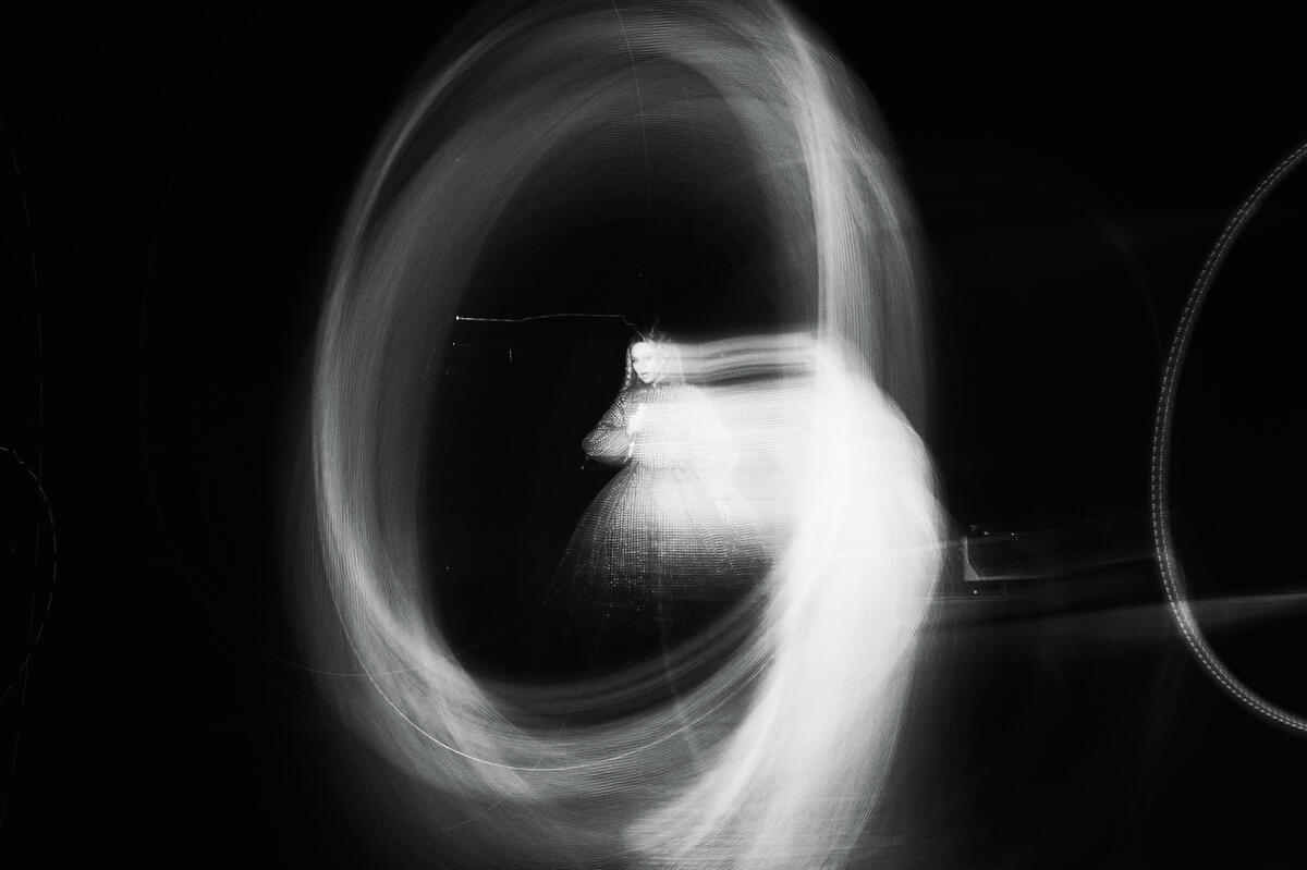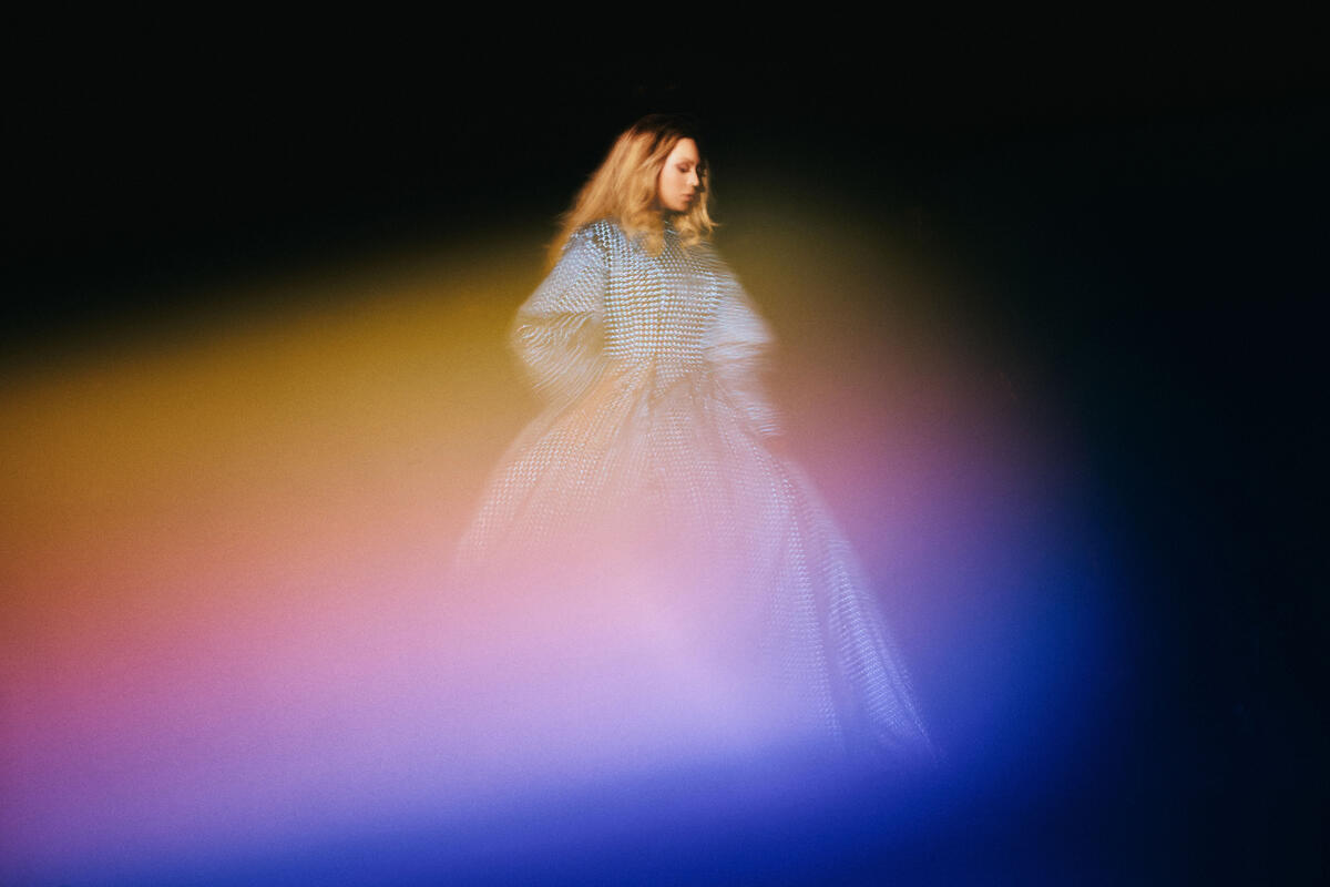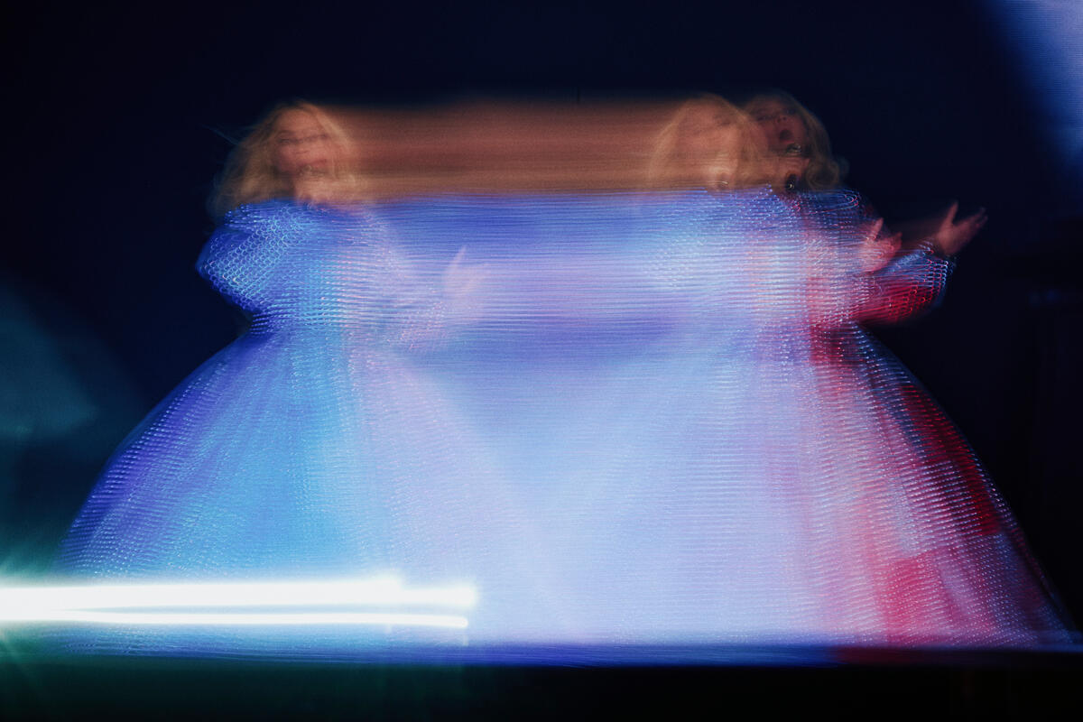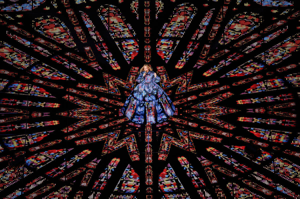 このDRESSは、楽曲「DAUGHTER」に合わせてプログラムされており、赤のタータンチェック柄から半身が青のチェックへ、さらに真紅のスパンコール、黒一色のロンプルイユ風レース模様へと、次々に変化していく。その後、ゴールドの輝きを放つスパンコールDRESSから、アメリカ国旗を想起させる赤・白・青のノイズパターン、そして白黒へのステンドグラス模様のグラフィックが現れ、フィナーレでは、ステンドグラスの光が星々の爆発のように広がり、やがて宇宙の闇へと溶け込む。その闇から再び光が降り注ぎ、DRESSがまばゆい輝きをまとって完成するという、壮大な演出が展開される。