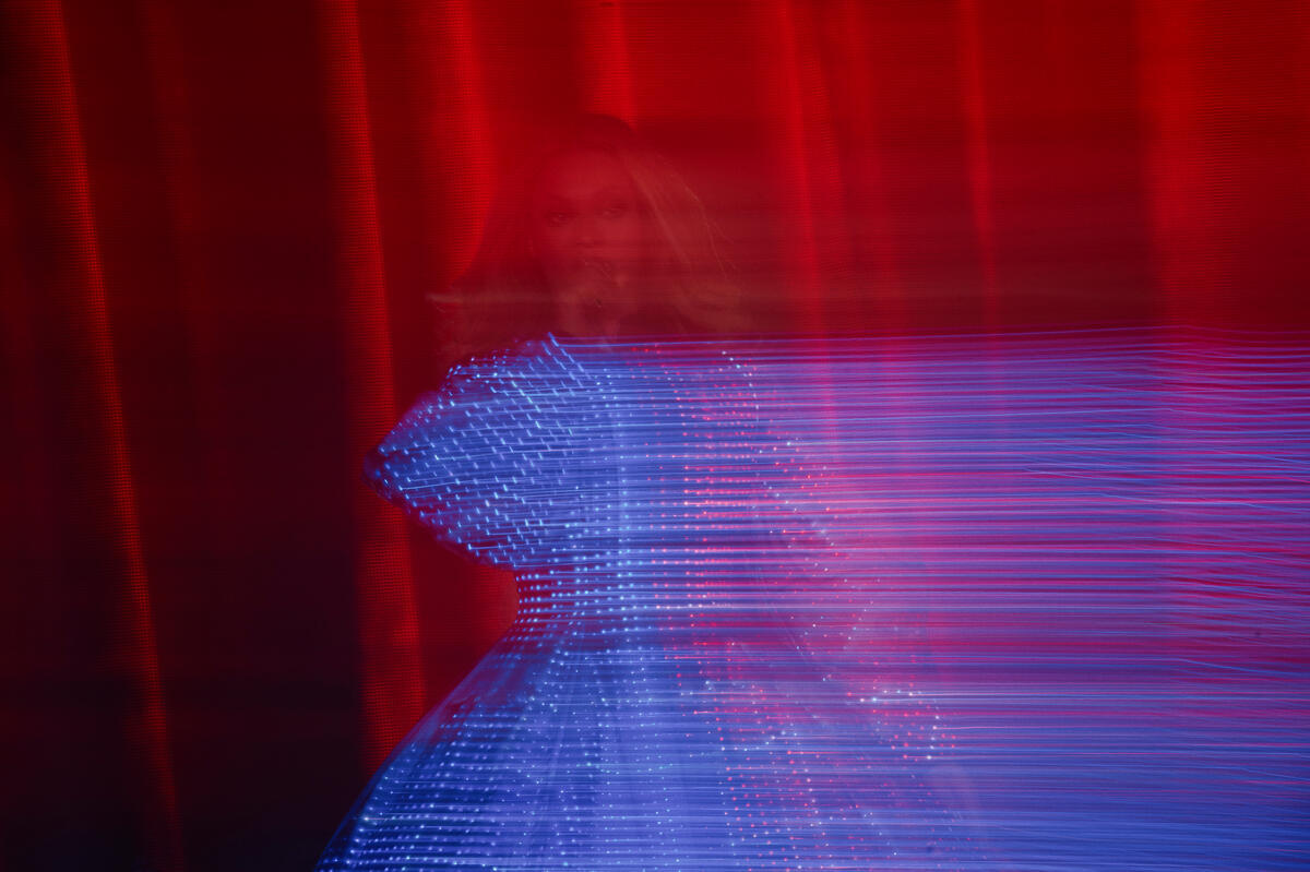 テクノロジー面では、アンリアレイジとクリエイティブカンパニーMPLUSPLUS(エムプラスプラス)による共同開発素材「LED TEXTILE」を使用。1着のDRESSに約3万5000個のフルカラーLEDを搭載し、無線制御システムや映像設計もMPLUSPLUSが担った。さらに、黒のDRESS表現には、京セラドキュメントソリューションズの次世代プリント技術「FOREARTH(フォレアス)」を採用。顔料インクジェット方式により、染料を用いず、水の使用量を99.98%削減したサステナブルな生産工程を実現。基布には、繊維メーカー・シキボウが開発した高機能素材「AZEK®」を採用。古代建築「校倉(あぜくら)構造」に着想を得た同素材は、光の透過性を活かして、布地そのものを映像スクリーン化することを可能にしている。
