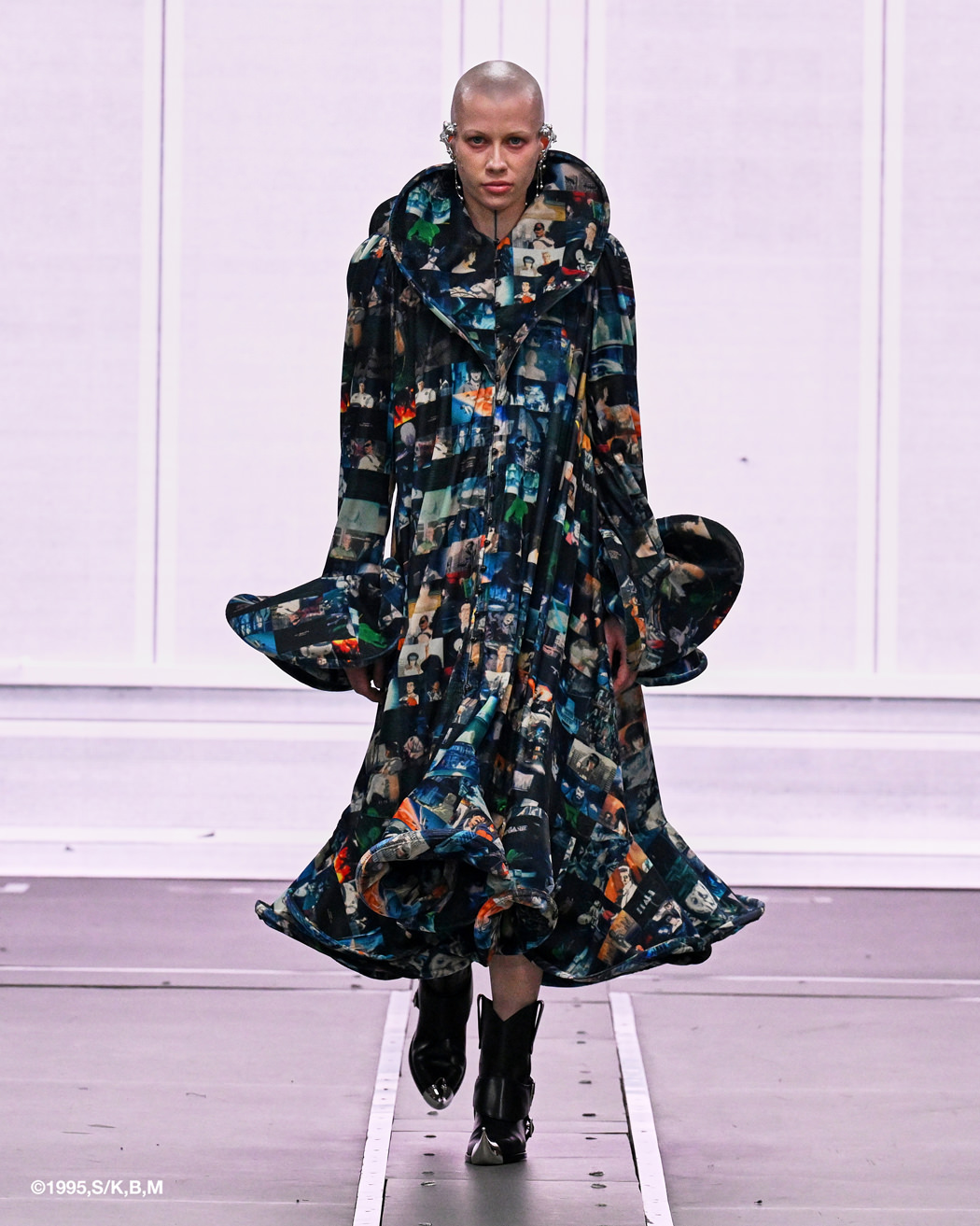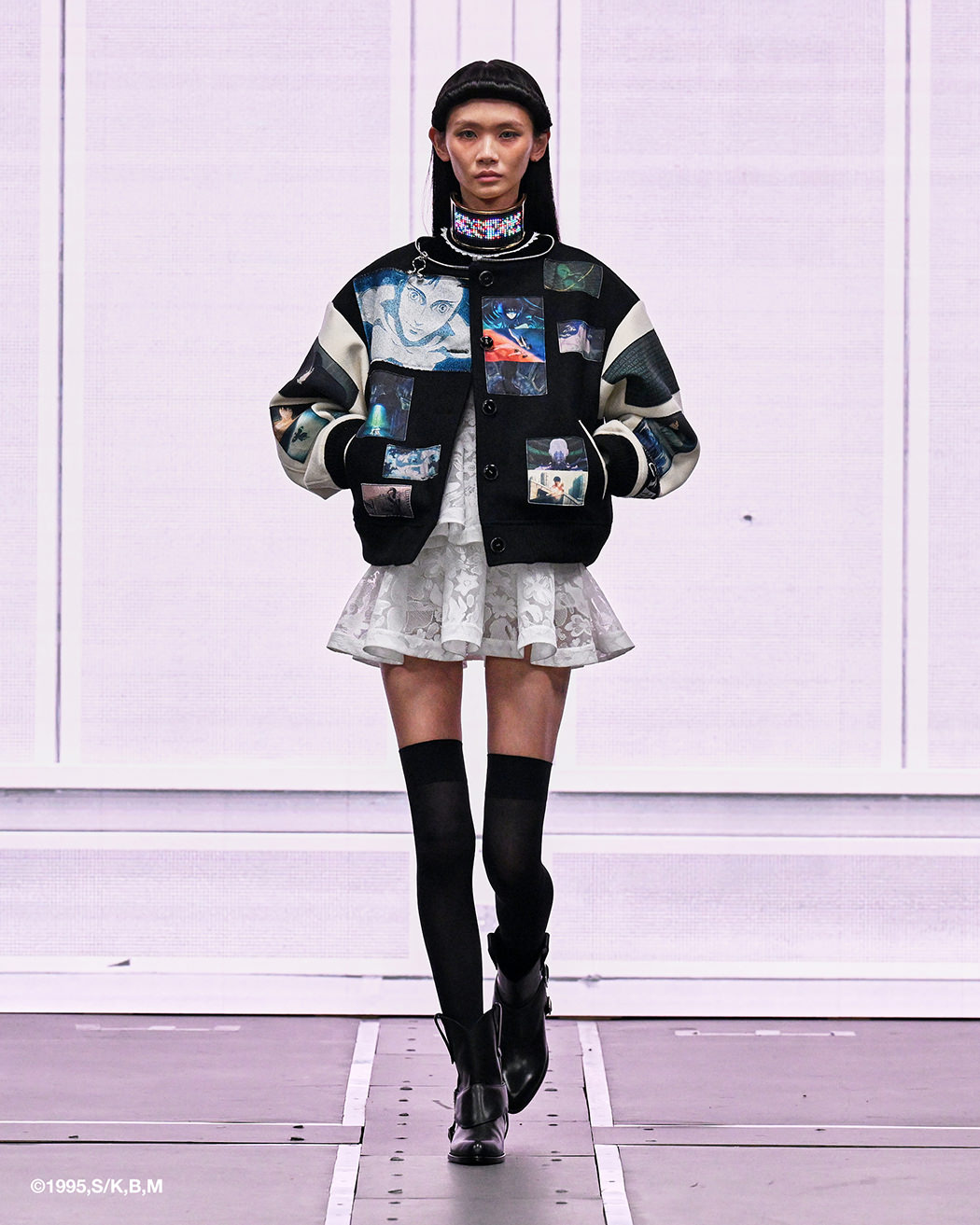 本COLLABORATIONアイテムでは、『攻殻機動隊』のアニメーションに登場する名シーンを断片的に切り取り、パッチワークとして縫い付けたブルゾンやプリントTシャツ、さらに冒頭からラストシーンに至るまでの約250の場面を連続的に再構成し、モンタージュとして表現した柄、そしてショーのラストシーンに登場する『攻殻機動隊』を象徴するデジタルコード柄を、アンリアレイジの定番である球体シャツやフレアスカートに落とし込んだアイテムを展開します。映像の断片、時間の連なり、そして情報の可視化。それぞれ異なる視点でデザインされた8型をラインナップしました。