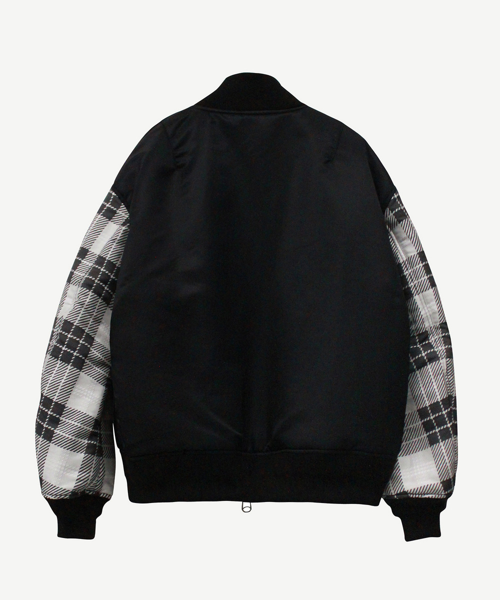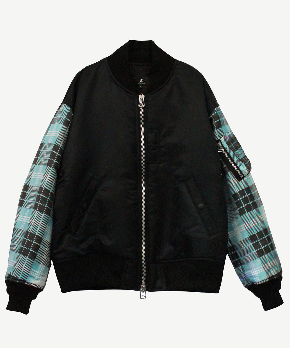 ベーシックなフォルムのMA-1。スリーブのチェックのテキスタイルがUVライト(太陽光)によって鮮やかに変化します。