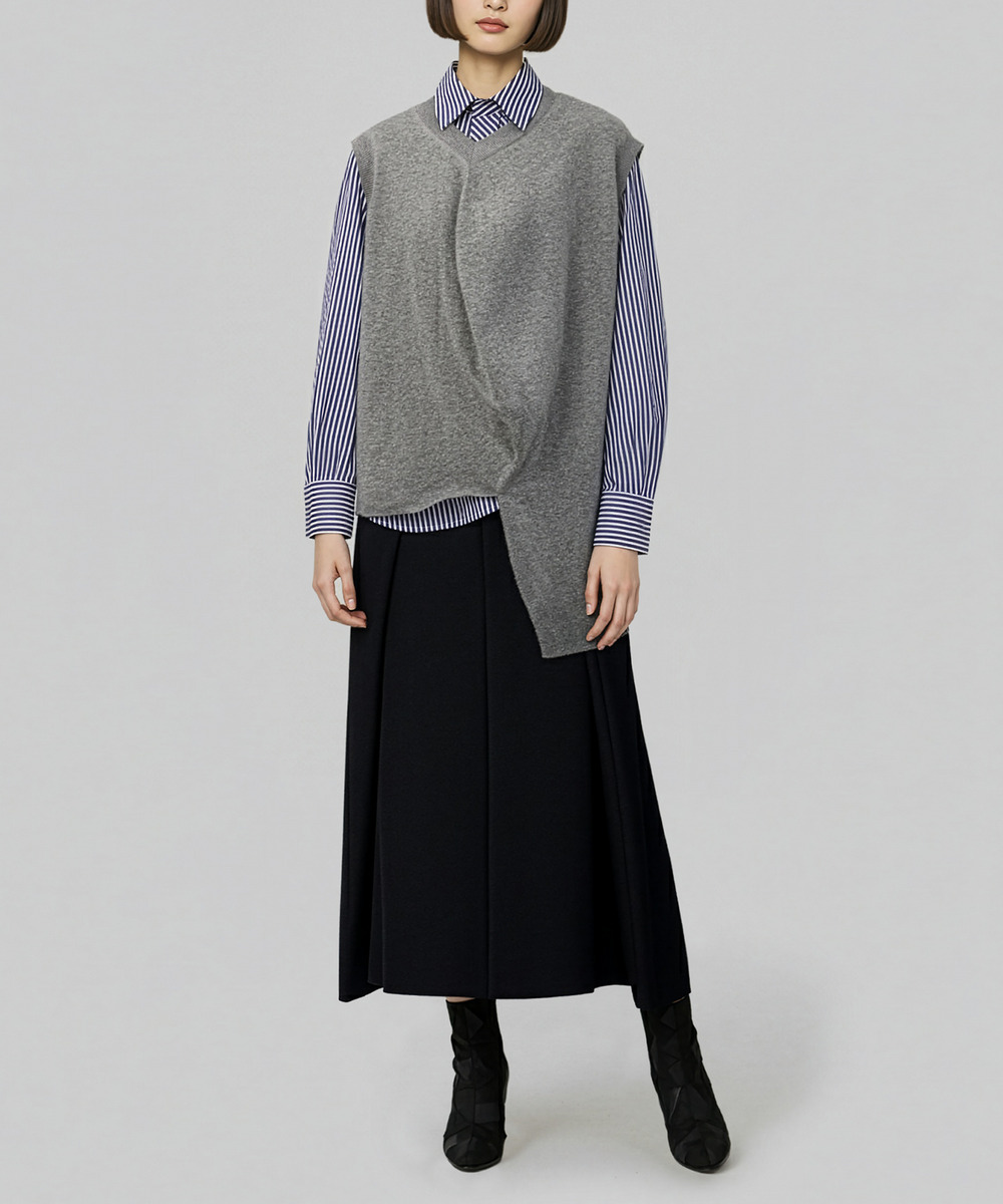 アンリアレイジ定番のボールモチーフをニットVestとして展開。 ボールの立体に着せ付けるパターンを用いたニットVestは、身体に添うことで、規則的だった形が自然なドレープとなり、ボリュームのあるシルエットに変換されます。 程よい厚みで落ち感を楽しめる一着。カラーはベーシックなキャメル、グレー、ブラックの3色展開で、重くなりがちな冬のコーディネートに軽やかさをプラスしてくれるおすすめアイテムです。 ボールシリーズは身体とはかけ離れたモチーフからつくることで、ジェンダレスな提案ができるのも特徴です。
