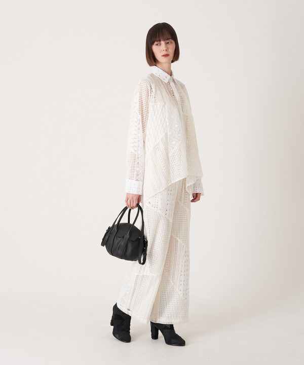 直線的な切り替えと、質感や柄の異なる様々なテキスタイルの風合いとのコントラストが魅力的な1着。