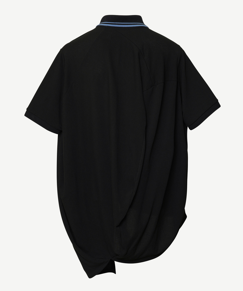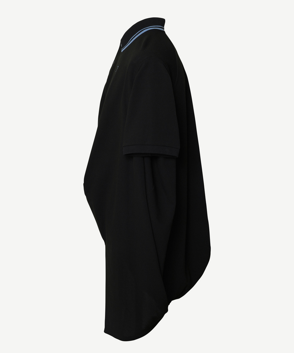 ボールの立体に着せ付けることができるパターンを用いたPolo shirtは、身体に添うことで規則的だった形が自然なドレープとなり、ボリュームのあるシルエットに変換されます。