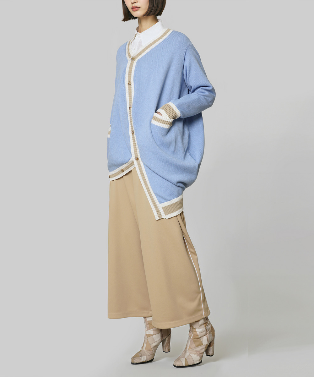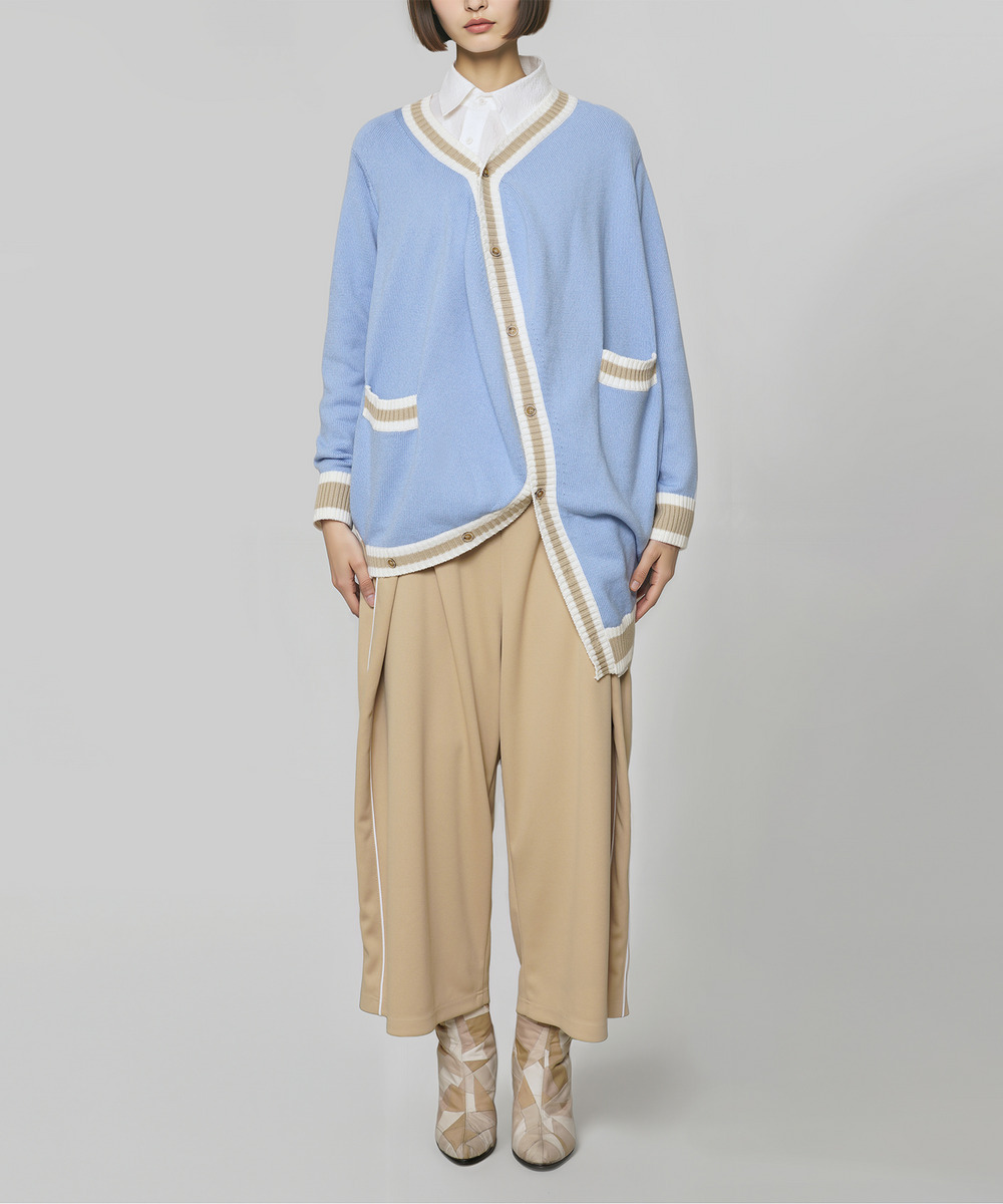 【 2026 SPRING/SUMMER PRE COLLECTION 】 アンリアレイジ定番のボールモチーフをニットCardiganとして展開。 ボールの立体に着せ付けることができるパターンを用いたCardiganは、身体に添うことで規則的だった形が自然なドレープとなり、ボリュームのあるシルエットに変換されます。 春らしい印象のコットンニットで編み立てたCardigan。 ライン入りのリブがアクセントとなり、プレッピースタイルに取り入れたい一着です。 軽やかな印象のライトブルーと、浅めでややネイビー寄りの色味のブラックの2色展開。 ポリエステルの軽さと丈夫さに、コットンの自然な風合いと柔らかさをバランスよく掛け合わせた素材です。型崩れしにくく、日常使いでも扱いやすい一方、コットンの心地よい肌触りがしっかり感じられるのが魅力。軽やかな着心地で季節の変わり目にも快適に羽織れるニットCardiganです。
