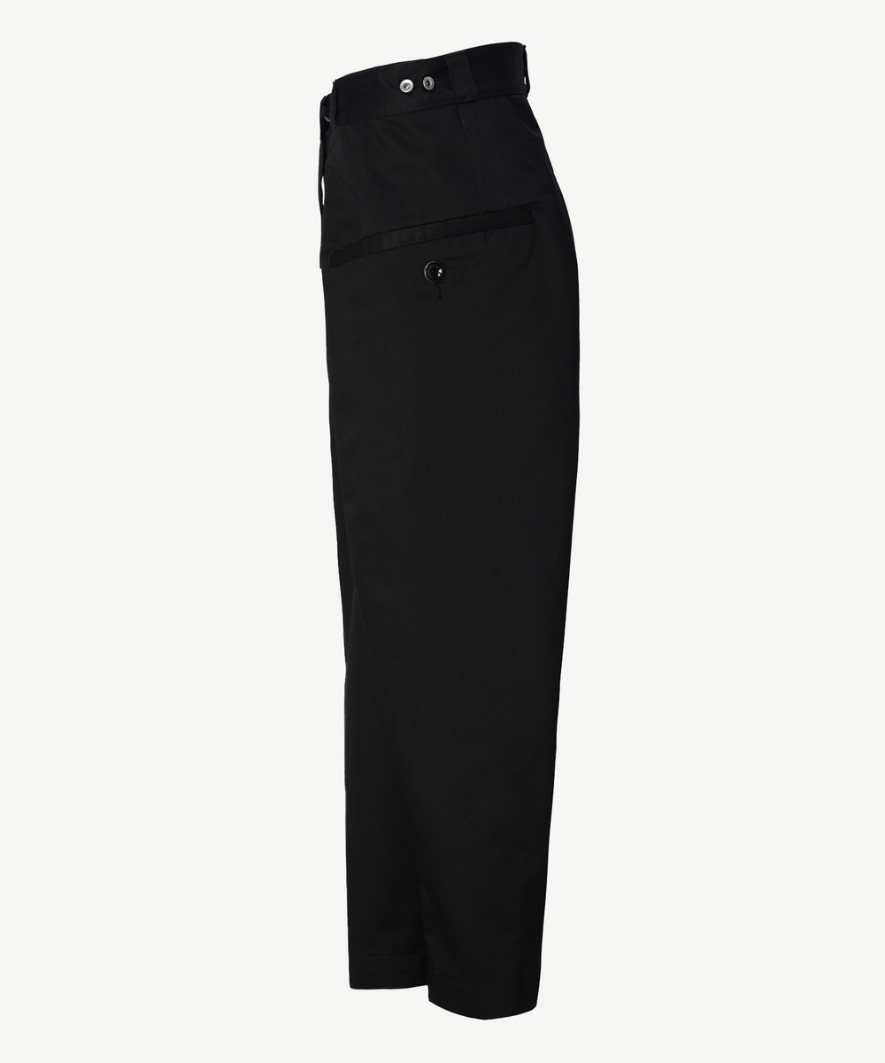 ANREALAGE’s signature wrapping chino pants have been updated. The distinctive silhouette is created by wrapping the excess fabric from the widened waistband. Adjusting the wrapped section with the waist belt allows for flexible changes in shape and fit. Crafted from a polyester twill fabric with mechanical stretch that responds to movement in all directions, the pants offer ease of movement and a light, comfortable feel while seamlessly fitting into everyday wear. The central fastening has been upgraded from a hook to a snap button, and the belt width and buckle have been refined with a D-ring design, making the pants even easier to put on and take off.