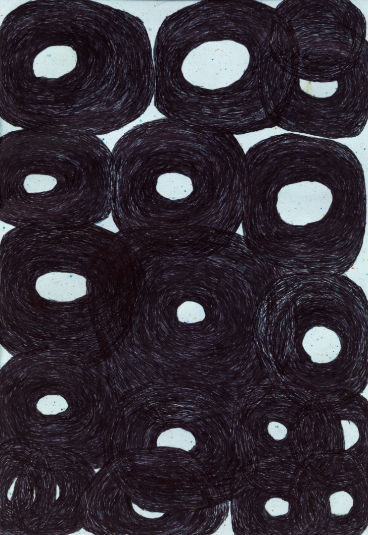 彼女の制作には、瞑想から生み出されるような果てしなさがある。完成形を目指して作り出しているのでなく、思いのままに打っていく点描や短い線の集積に何かを見出し、その世界にとめどなく没入して行く。ある時はふわふわと、夢見るように周囲の誰かに笑顔で話しかけ、またある時は、一人自分の内側の世界に深く意識を沈めてる。そのまなざしは、彼女の心だけに映る何かを追いかけてたゆたう。不思議な空気が彼女と彼女の制作には漂っている。