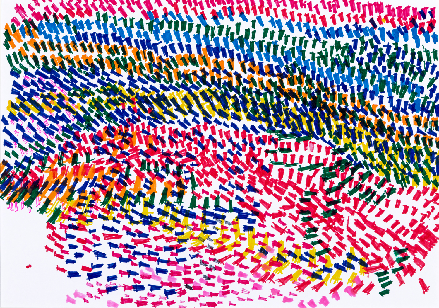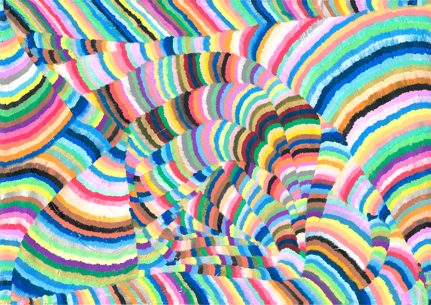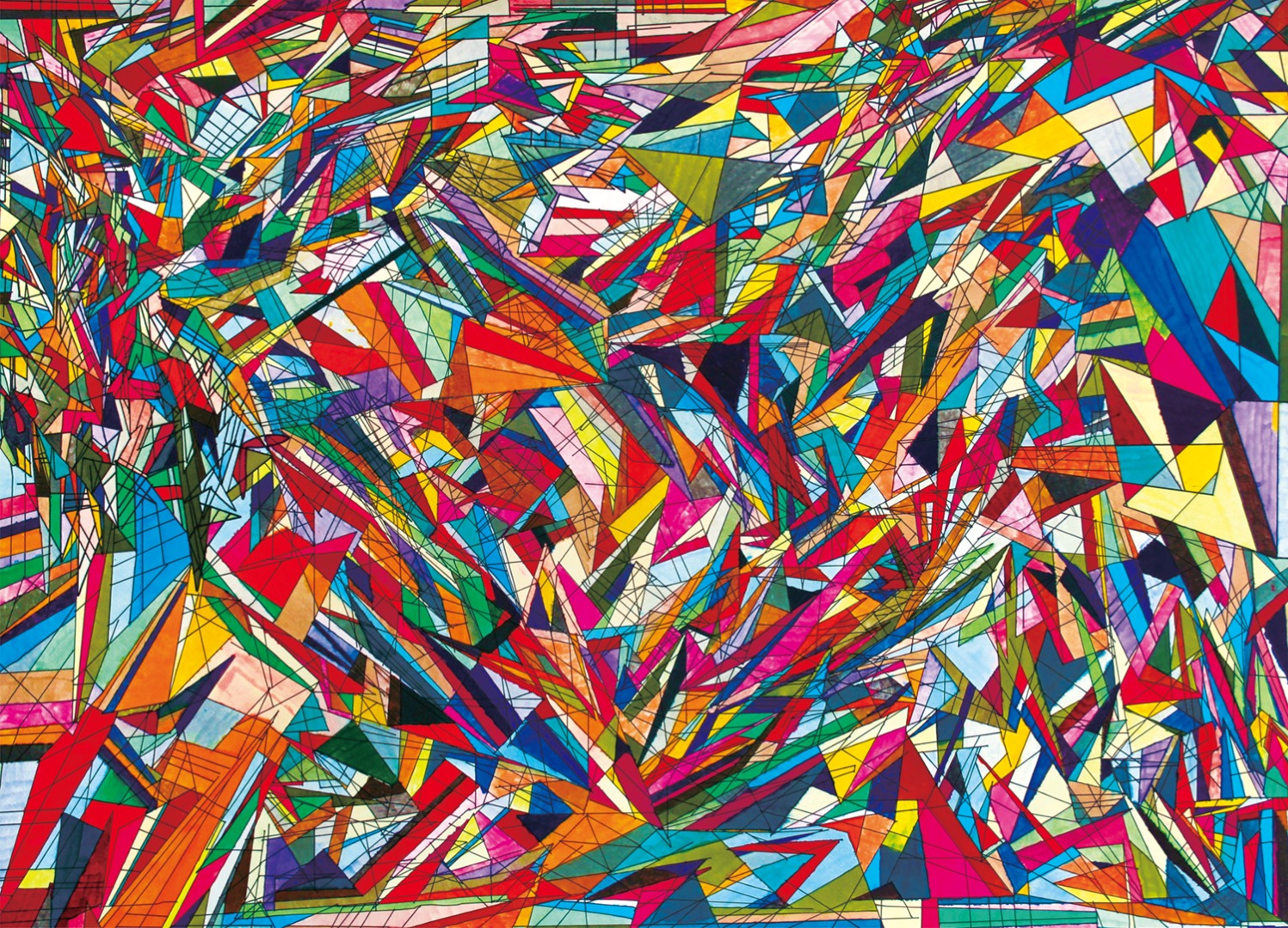 水性ブラシマーカーを用い、躍動に満ちた色彩ひしめく緻密な画面を生み出す。
