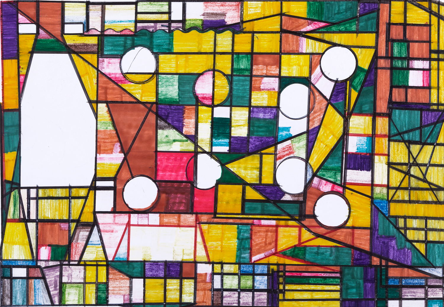 色鮮やかな作品の中に、目を引く四角や丸の白い空間。一見抽象的な幾何学パターンを描いたように見える絵だが、それが独自のアレンジによって描かれた建築物や乗り物だと知ったら多くの人が驚くだろう。子どもの頃、彼はこの表現様式を誰に習うことなく独創によって生み出す。以来、半世紀余りにわたってただ一つの手法で創作し続け、その作品数は数百点に及ぶとされる。アトリエの一角で、机からはみ出るほどの大きな画用紙に、フェルトペンを握りしめながら大きな定規を巧みに扱う彼の姿からは、何年もの長い年月を感じ取ることができる。
