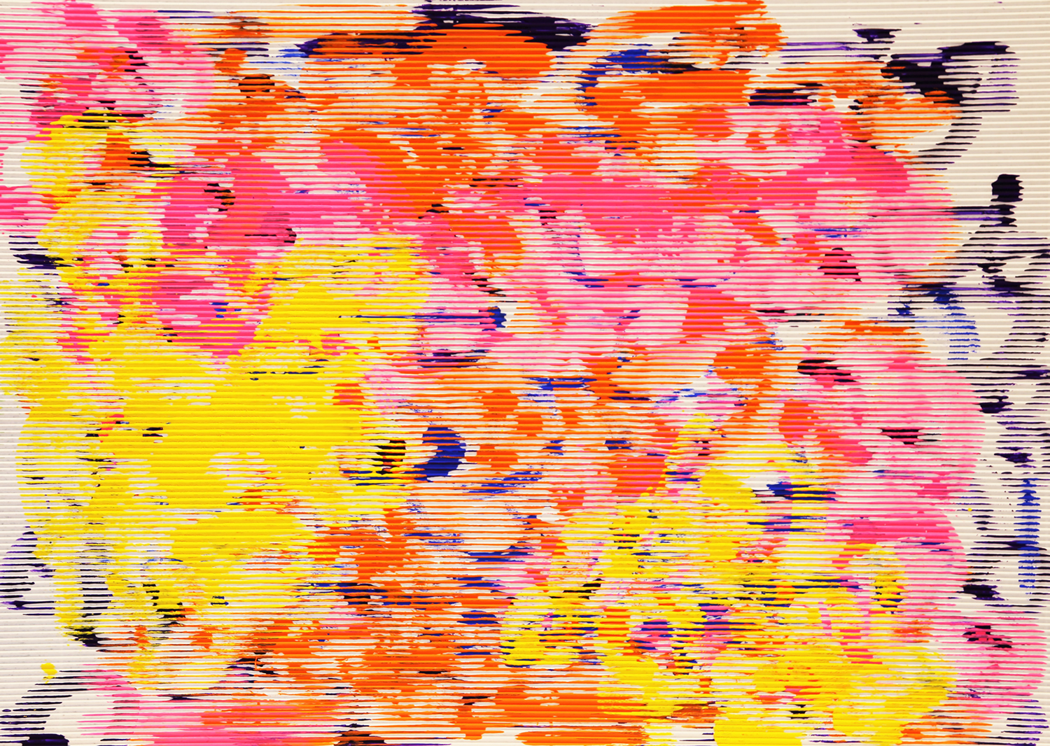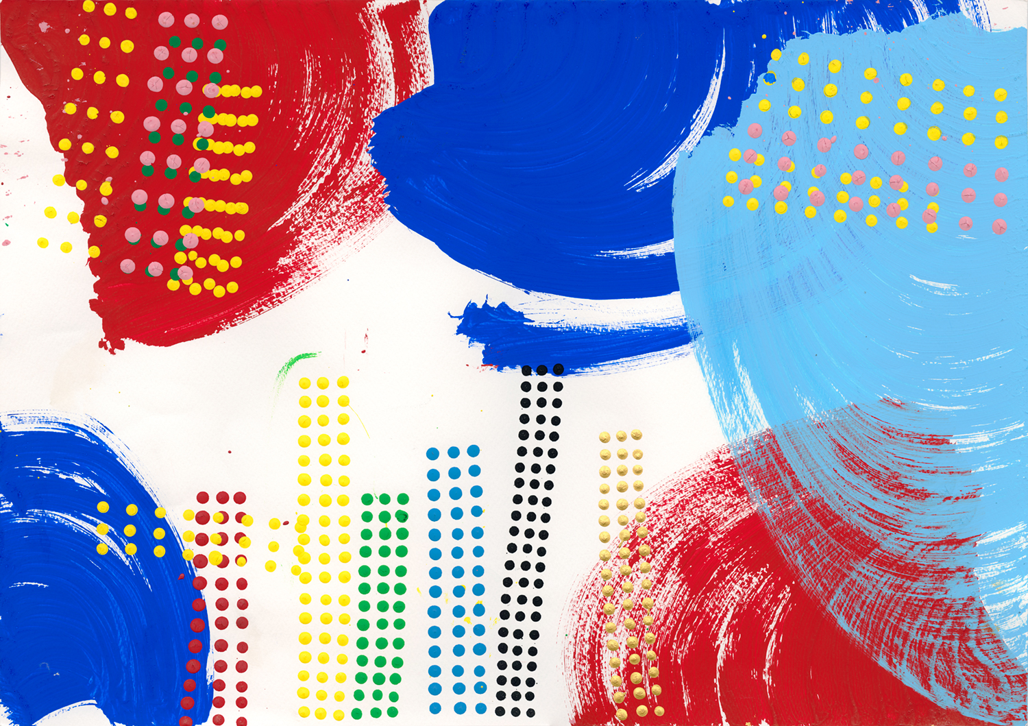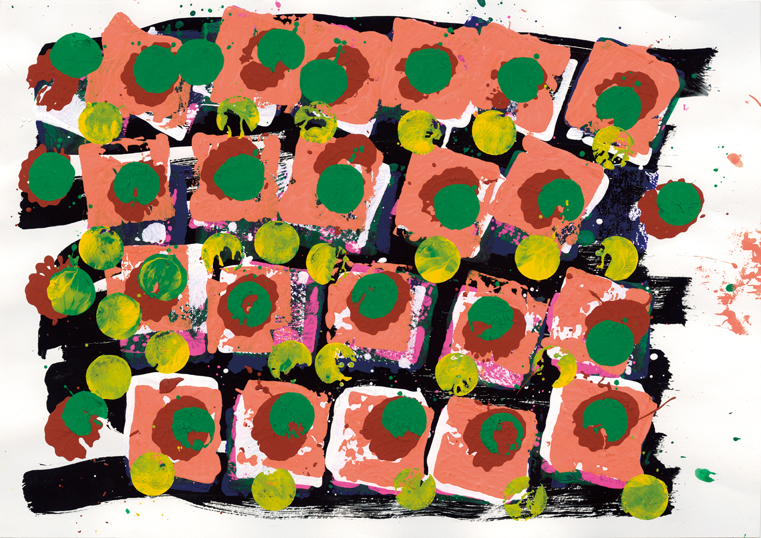 1996年生まれ 滋賀県在住 2015年から『やまなみ工房』に在籍 もともと創作活動に消極的だった彼が、気負いなく作業感覚で取り組める方法のひとつとして、スタンプ押しの活動が始まった。巻いて棒状にしたダンボール紙や紙コップ、ゴム判子等、様々な素材の判子を用いて自分の好きな色を決めて、判子を一つ一つ確実に丁寧に押してゆく。取り組む中で徐々に創作に対する苦手意識から解放され、作品が完成するたびにやりがいや喜び、そして彼の中で創作に対する自信が深まった。 今では内向的な彼が自己表現の一つとして取り組める活動となる。