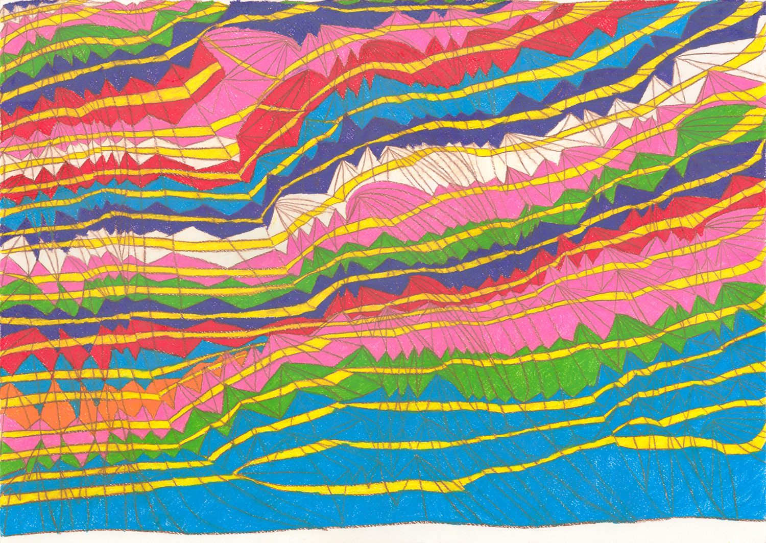 1994年生まれ 滋賀県在住 2013年から「やまなみ工房」に在籍 彼女がいつも大切に持ち歩くBAGの中には、大好きなアニメのDVDやCD、本がたくさん詰まっている。その中にある一冊のぬり絵を取り出すと、いつもの作品解説が始まる。 彼女が描く作品のほとんどは「お城」。それは、ぬり絵に描かれた女児向けアニメに登場したお城をイメージして描いているそうだ。 アニメに登場する主人公3人のキャラクターカラーであるピンク、黄色、水色は作品にも反映され3色を主に使用し、三角形や四角形を規則的に重ね合わせ色を塗り積み上げ城は築かれていく。