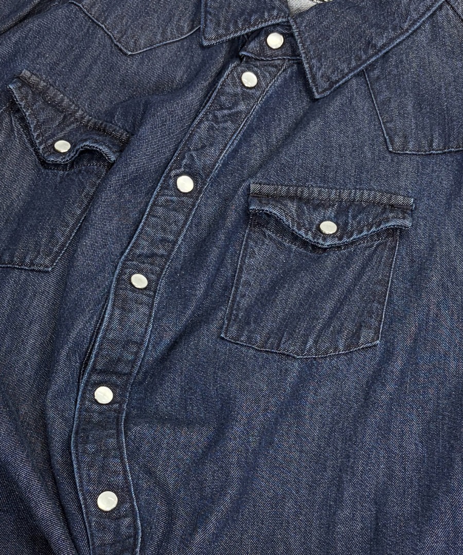ウエスタンシャツに用いられる、光沢感のあるパールスナップボタンもアクセントになっています。