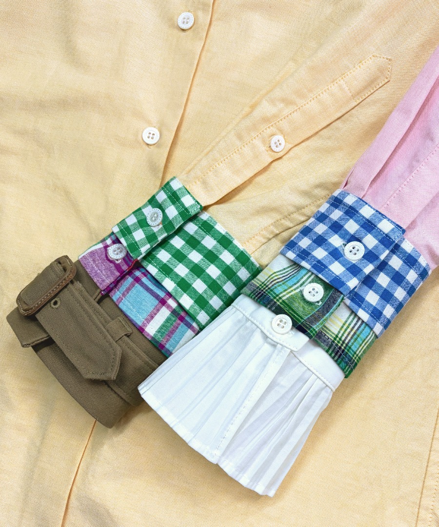 オックスフォードシャツの袖口に、異素材の生地をレイヤードしたようなデザインが特徴の一着です。