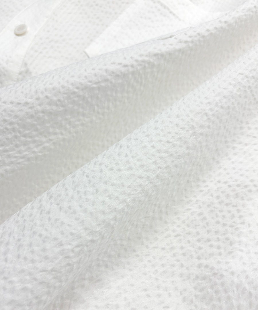 ポリエステルの軽さと乾きやすさに、コットンの柔らかい風合いをほどよくブレンドしたシアサッカー生地を使用。表面に細かな凹凸のある特有の“しぼ”が肌離れをよくし、汗ばむ季節でもさらりとした着心地をキープします。